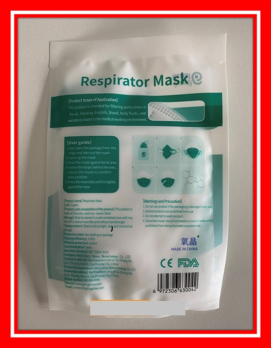Numărul alertei: A12/00696/20 Categorie: Echipamente de protecție Produs: Mască de filtru de particule Marcă: Garry Galaxy Denumire: Respirator Mask Tipul/numărul modelului: N95 cod de bare: 6972306630042 Numărul lotului: 201201, Data:20200324 Contrafăcut: NECUNOSCUT Tip de risc: Riscuri pentru sănătate/altele Retenția de particule/filtrul materialului este insuficientă (valoarea măsurată este ≤ 71 %).În consecință, o cantitate excesivă de particule sau de microorganisme poate trece prin mască, sporind riscul de infecție în cazul în care nu este combinată cu măsuri de protecție suplimentare./produsul/produsul nu respectă Regulamentul privind echipamentele individuale de protecție și standardul european relevant EN 149.
