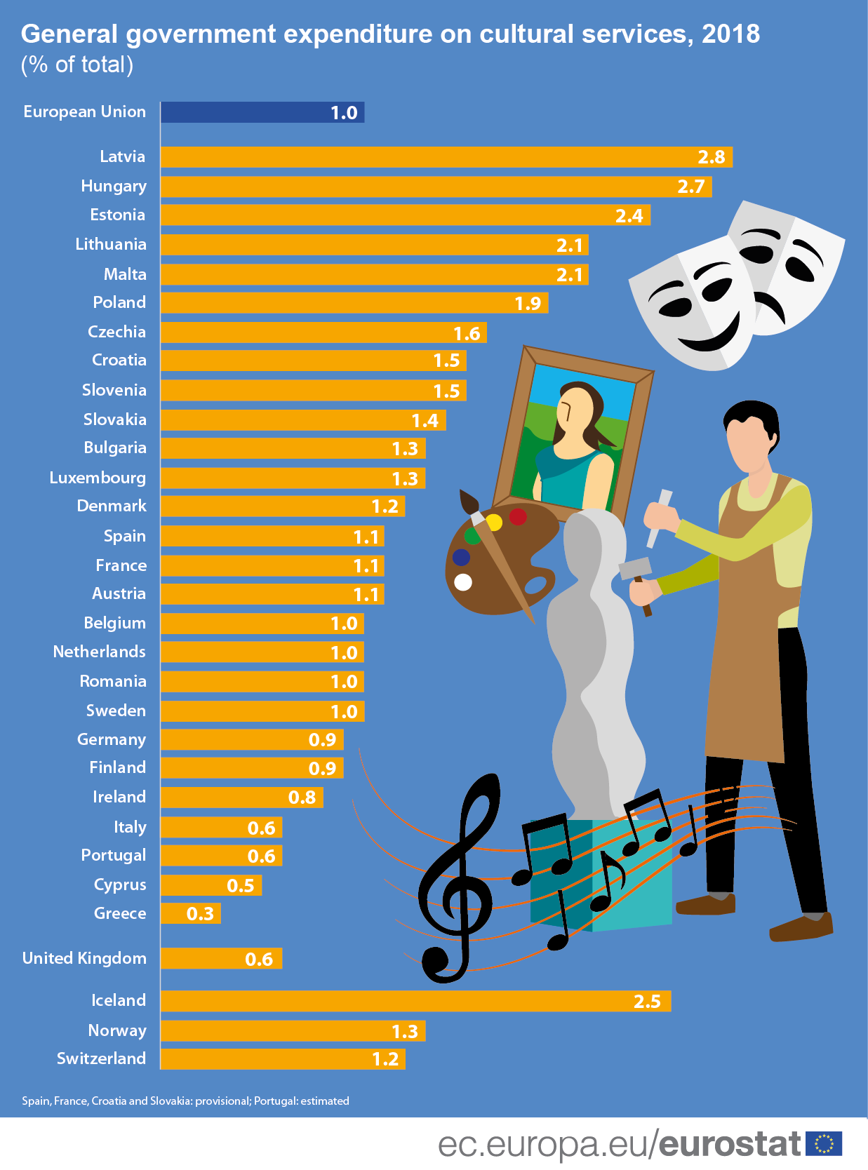 Cu toate acestea, există diferențe considerabile între statele membre ale UE. În 2018, Letonia a înregistrat cea mai mare pondere a serviciilor culturale în cheltuielile administrației publice (2,8%), urmată de Ungaria (2,7%) și Estonia (2,4%). Cea mai mică cotă a fost înregistrată în Grecia (0,3%), acțiunile din Cipru (0,5%), Italia și Portugalia (ambele 0,6%).