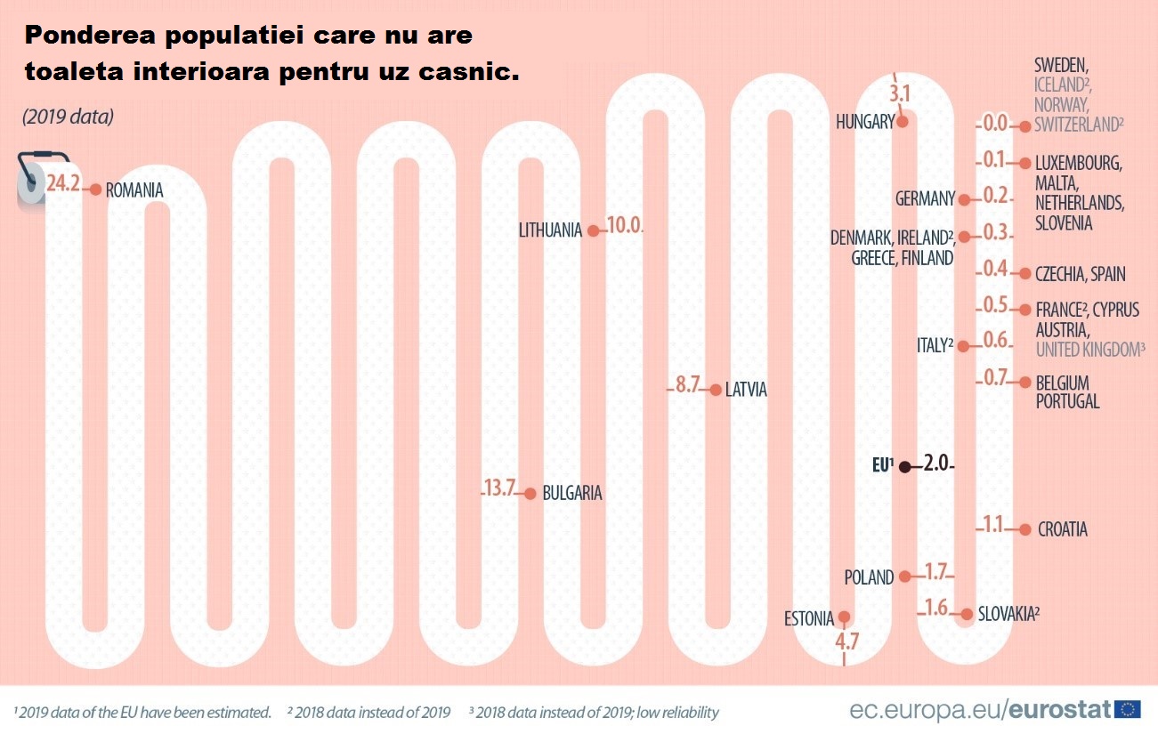 Aproape una din patru persoane din România a raportat că gospodăria lor nu avea o toaletă în interior pentru utilizarea exclusivă a gospodăriei (24,2%). Aceasta a fost de departe cea mai mare pondere dintre statele membre ale UE. România a fost urmată de Bulgaria (13,7%), Lituania (10,0%), Letonia (8,7%), Estonia (4,7%) și Ungaria (3,1%).