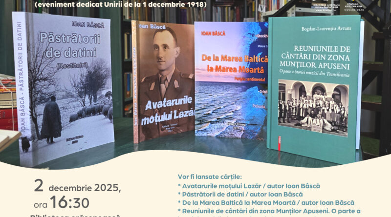 Evenimentul cultural – educativ va avea loc la Biblioteca Orășenească „Marin Preda” Abrud, cu începere de la ora 16:30. După evocarea importanței zilei de 1 Decembrie 1918 de către prof. Alin Bar de la Liceul „Horea, Cloșca și Crișan” din Abrud, vor lansa cărți autorii Ioan Bâscă și pr. prof. Bogdan Laurențiu Avram.