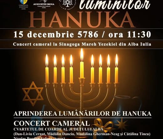 La Alba Iulia, Hanuka va fi marcată prin aprinderea lumânărilor de Hanuka și un concert cameral la Sinagoga Mareh Yezekiel.